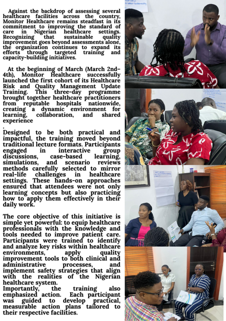 Following a thorough assessment of multiple healthcare facilities, Monitor Healthcare Nigeria continues to intensify its efforts toward improving quality standards and patient safety across the country. Recognizing the growing need for structured risk management practices, the organization recently launched its Risk Management Training Initiative—an impactful step toward addressing systemic gaps and equipping healthcare professionals with practical, solution-driven skills.