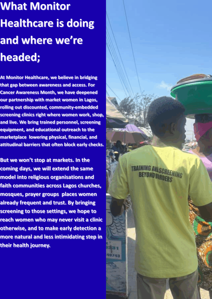 As part of its ongoing mission to make preventive healthcare accessible, Monitor Healthcare has intensified efforts this Cancer Awareness Month through community partnerships. The organisation continues to collaborate with Lagos market women, providing discounted breast screening and health education in busy local markets.